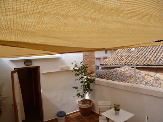 En nuestra zona común exterior, una de las areas sin duda más acojedoras de todo el hotel, disponemos ahora de un toldo que conforma una estrella. En este espacio los clientes suelen tomar algo por la tarde mientras disfrutan del clima, perfecto en casi cualquier época del año.